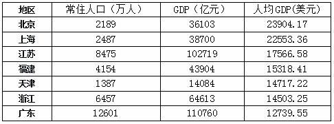 从全国来看,北京人均GDP排名第一,达到16.49万元,折合2.39万美元;上海以2.25万美元紧跟在北京之后,目前也只有京沪的人均GDP超过2万美元。