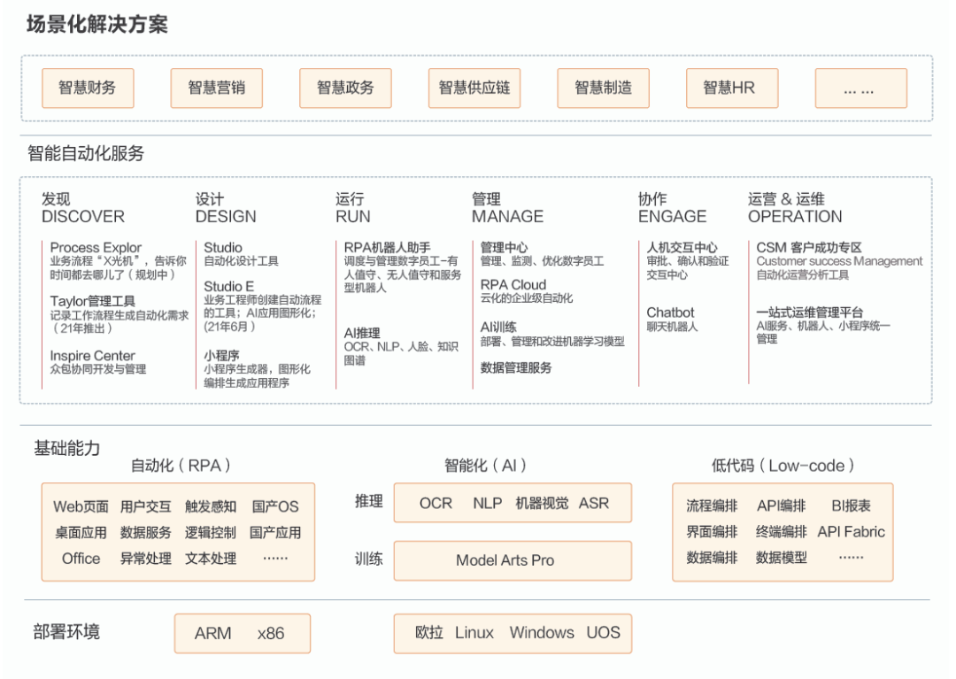 此外,在运行阶段,为了更好的拥抱和支持国家信创要求,新产品支持在鲲鹏生态下的软硬件系统部署,并支持基于国产应用的自动化流程运行,帮助用户在实现自主可控的同时降低TCO。