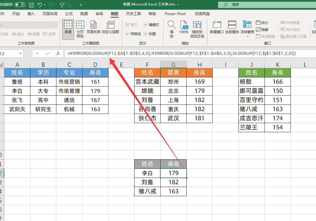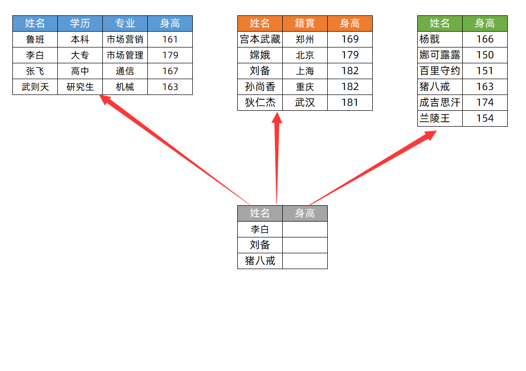Hello,大家好,对于IF函数的嵌套相信很多人都不陌生,但是vlookup函数的嵌套却鲜有人知,今天就跟大家分享下它的使用方法,可以实现一次查找多个表格的效果。如下图,我们想要查找李白,刘备和猪八戒的身高,但是不知道它们到底是在上面的哪一个表格中,很多人遇到这样的问题,都是先确定数据的位置,然后再查找数据。相当的较麻烦的。当我们掌握了vlookup函数的嵌套之后,就能实现一次查找三个表格的数据,快速提高工作效率,简单又实用,下面我们就来学习下吧