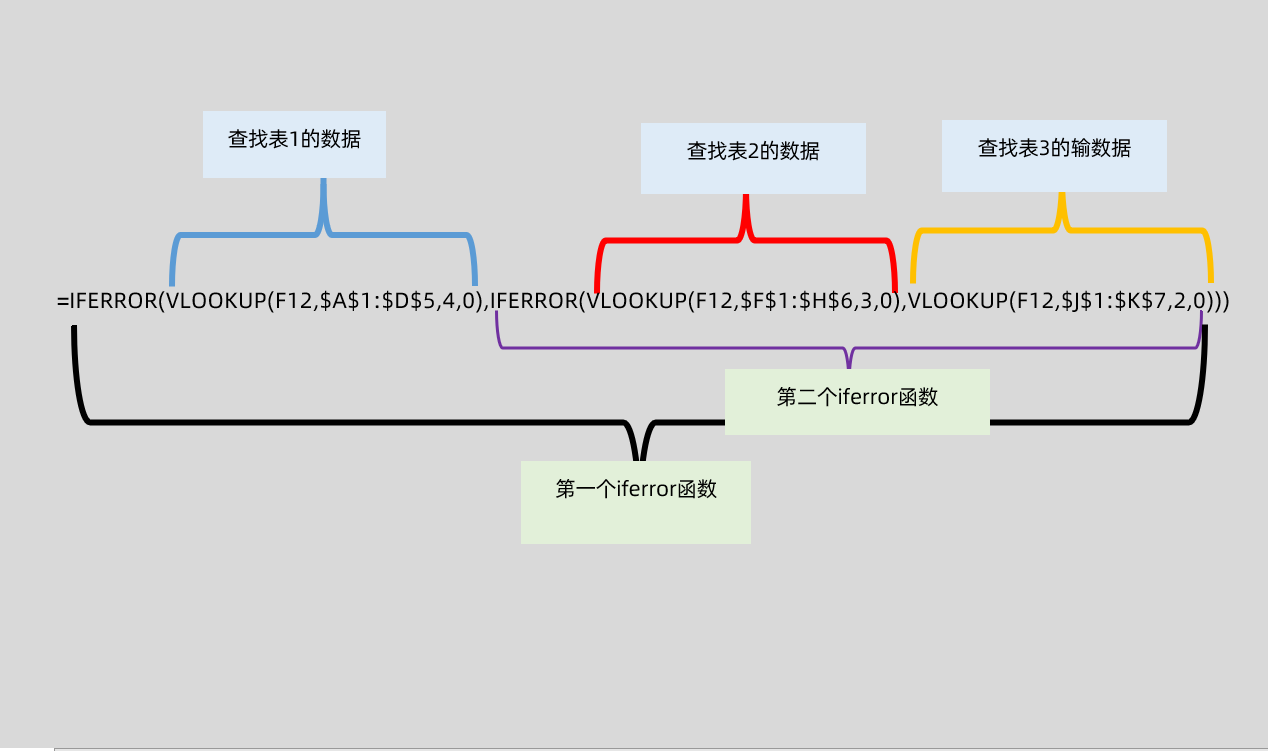函数的计算顺序是从左向右依次计算,第一个IFERROR函数的第一参数查找的是表1的数据,如果这个为错误值,就会返回第一个IFERROR函数的第二参数,在这里第二参数中我们嵌套了另一个IFERROR函数,它就会继续向下查找表2与表3的数据,这个就是它的计算过程
