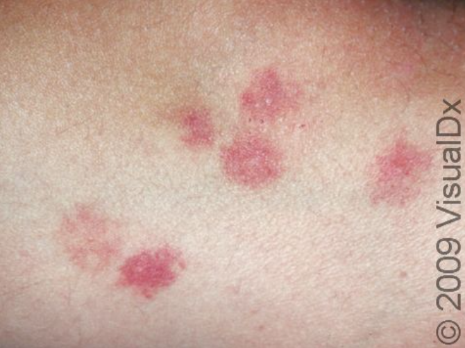 (臭虫叮咬可能在炎症的红色圆圈内有一个中央的较暗区域)