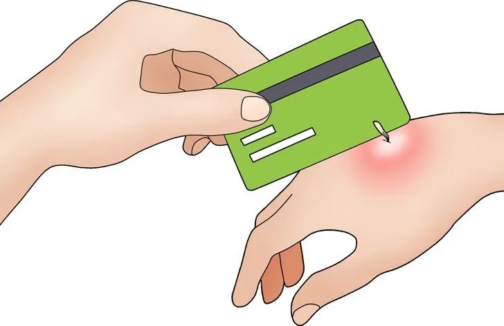 如何处理:蜜蜂叮咬后,毒液会在几秒内释放,所以首先应该把皮肤上的刺处理掉,但避免用手或镊子直接拔除,因为这可能会将更多的毒液挤压到皮肤中,可以找一张卡片按照下面的操作把刺刮掉。