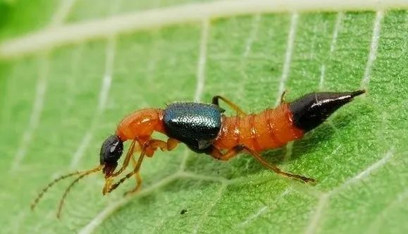 隐翅虫有很多种,有一些无毒,有一些在人体接触其体液后会引起急性红斑疱疹性损害的皮肤病,比如下面这种全身橘红色,头部、鞘翅和尾部呈青黑色的毒隐翅虫。