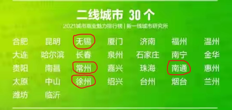 二线城市等级中,江苏共有4个城市,分别是:无锡、常州、南通、徐州。