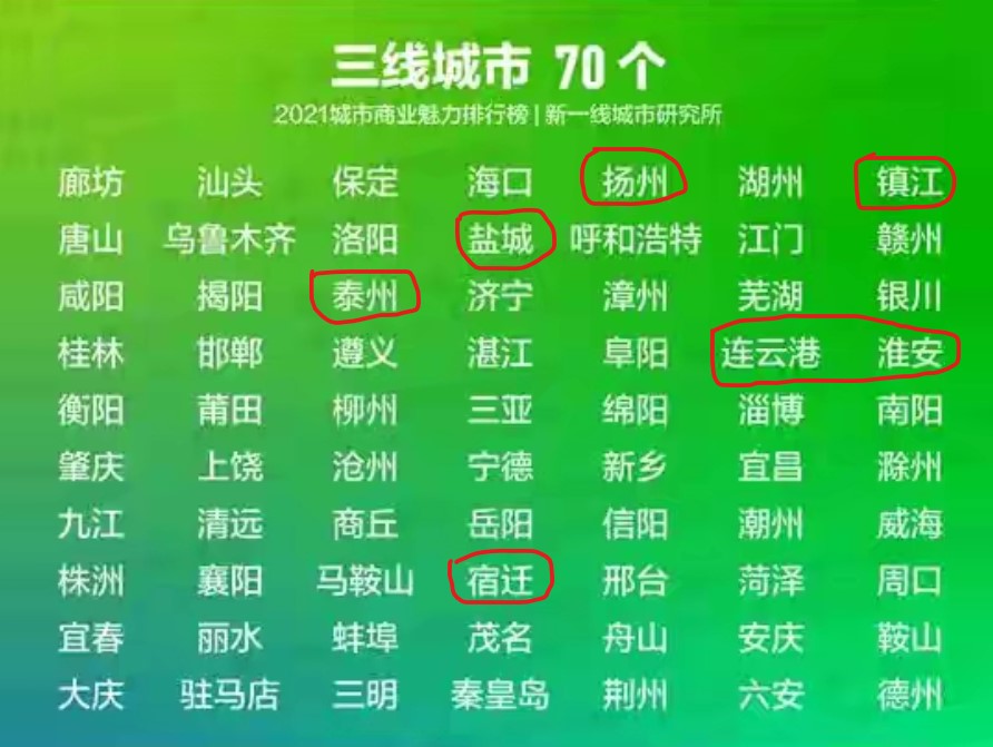江苏的三线城市是最多的,达到了7个,分别是:扬州、镇江、盐城、泰州、连云港、淮安、宿迁。