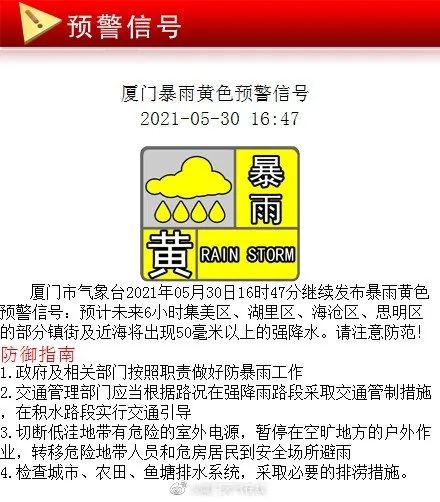 厦门暴雨黄色预警信号