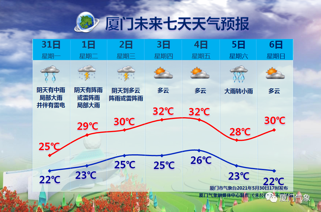 厦门地区天气:阴天有阵雨或雷阵雨,局部大雨,东北风3~4级转偏南风2~3级,气温:23~29℃