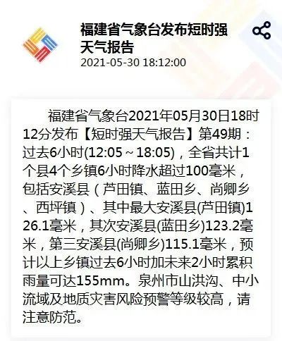 福建省气象台2021年05月30日18时12分发布短时强天气报告:过去6小时(12:05~18:05),全省共计1个县4个乡镇6小时降水超过100毫米。
