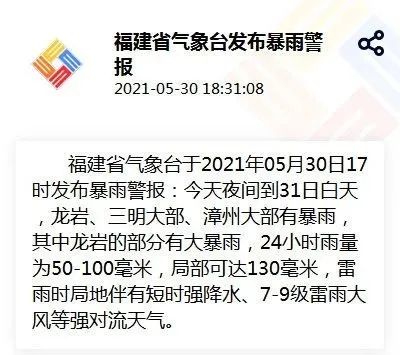 福建省气象台于2021年05月30日17时发布暴雨警报:今天夜间到31日白天,龙岩、三明大部、漳州大部有暴雨,其中龙岩的部分有大暴雨,24小时雨量为50-100毫米,局部可达130毫米,雷雨时局地伴有短时强降水、7—9级雷雨大风等强对流天气。