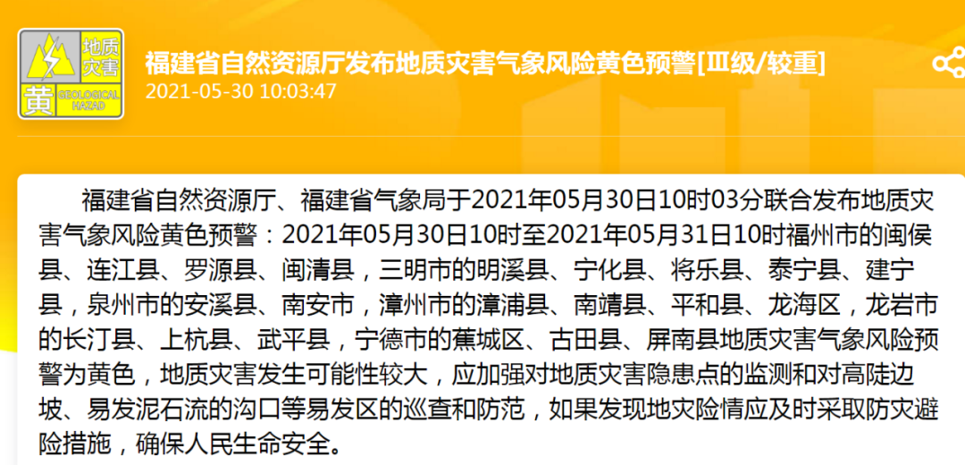 福建省自然资源厅、福建省气象局于2021年05月30日10时03分联合发布地质灾害气象风险黄色预警: