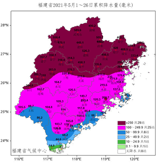 特别是五月,福建已经历了3次暴雨过程。截至28日,建瓯、松溪、福鼎、屏南、福安、柘荣、霞浦和将乐累积暴雨日数已突破5月同期历史极值,屏南21日142.5毫米的降水突破5月同期日最大降水极值。五月(5月1~28日)全省平均降水量274毫米,偏多72.3毫米(35.8%)。