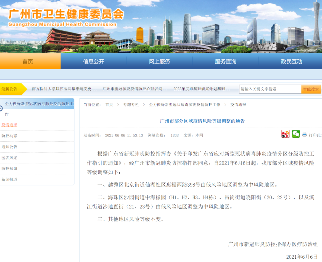 据广州市新冠肺炎防控指挥办医疗防治组今天(6月6日)中午发布,根据广东省新冠肺炎防控指挥办《关于印发广东省应对新型冠状病毒肺炎疫情分区分级防控工作指引的通知》,经广州市新冠肺炎防控指挥部同意,自2021年6月6日起,广州部分区域疫情风险等级调整如下:
