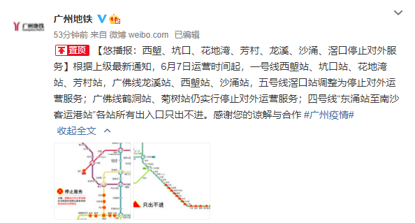 广州地铁6月6日发布消息:根据上级最新通知,6月7日运营时间起,一号线西塱站、坑口站、花地湾站、芳村站,广佛线龙溪站、西塱站、沙涌站,五号线滘口站调整为停止对外运营服务;广佛线鹤洞站、菊树站仍实行停止对外运营服务;四号线“东涌站至南沙客运港站”各站所有出入口只出不进。