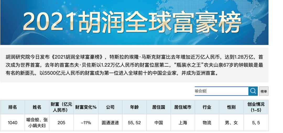 2016年,圆通速递舍弃独立IPO的方式,借壳“大杨创世”成功上市。如今,圆通速递市值保持在330亿人民币。《2021胡润全球富豪榜》显示,喻会蛟、张小娟夫妇身家205亿。