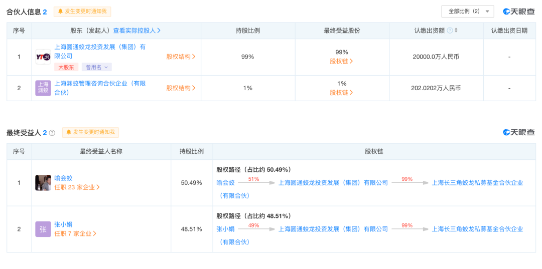 经查询发现,圆通蛟龙投资正是圆通速递的控股母公司,成立于2005年,经营范围包括实业投资、企业管理咨询等,主要投资于物流行业陆运、空运的基础设施建设等领域,提供投资咨询领域的综合服务。股东信息显示,喻会蛟占股51%,张小娟占股49%。这意味着,喻会蛟、张小娟是上述私募股权投资公司的实际受益人。