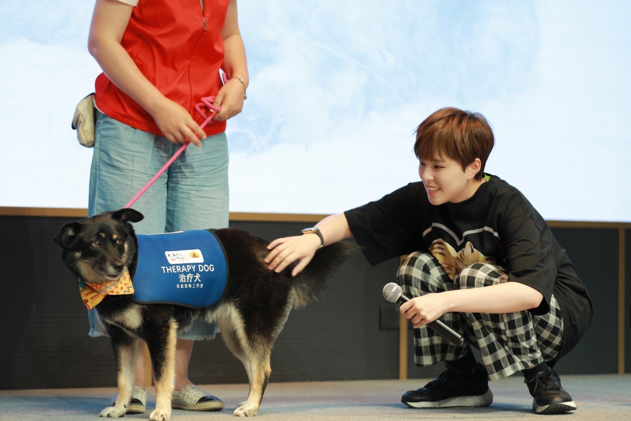 爱心宣传大使泰籍华裔女歌手、演员杨芸晴(Sunnee)现场和治愈犬亲密互动。