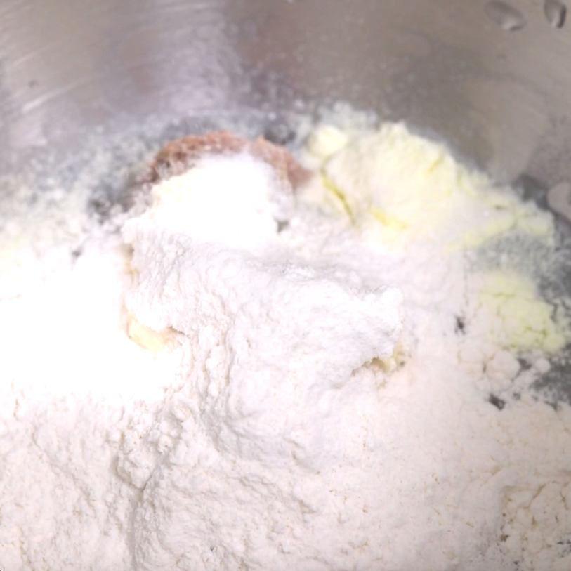 依次加入27g蛋液、103g冰水、2.5g酵母、8g奶粉、15g细砂糖、3g盐和190g高筋面粉。