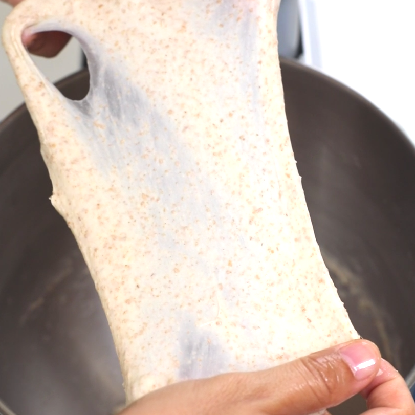 继续6档搅拌8分钟,直到可以撑开大片透明的薄膜,且破洞裂口呈光滑状。搅拌档位和时间仅供参考,具体我们以状态为准。