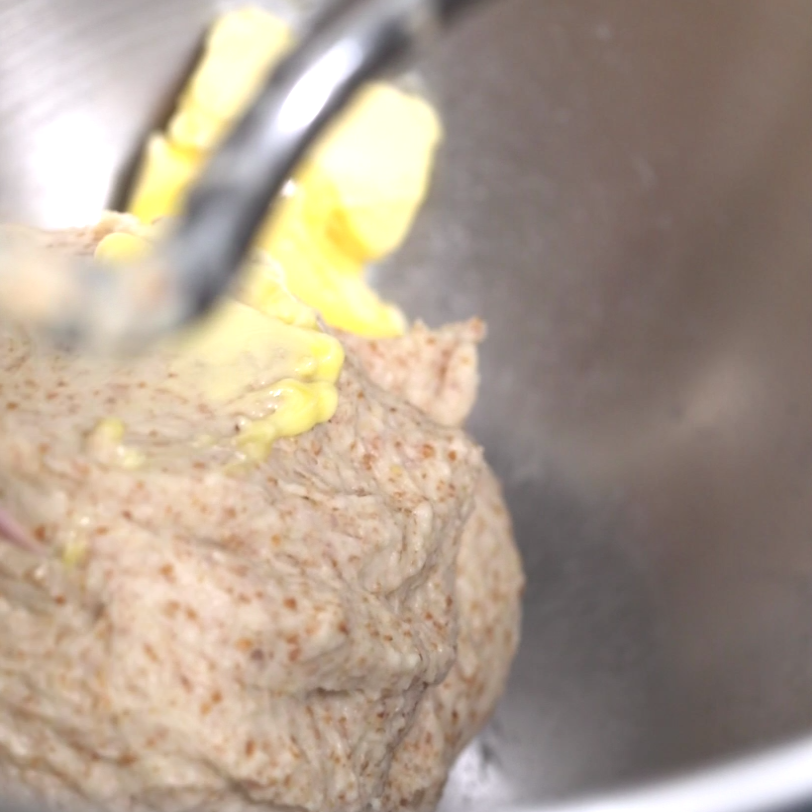 先5档搅拌5分钟至成团,加入提前软化的20g黄油。这里用的是厨师机,如果你有其它搅拌工具,例如面包机都可以,包括手揉也可以,但如果是新手,夏天手揉面失败率很高,因为我们要在20分钟内揉出膜,以避免面团发烫,而新手往往要揉半个小时乃至更久。