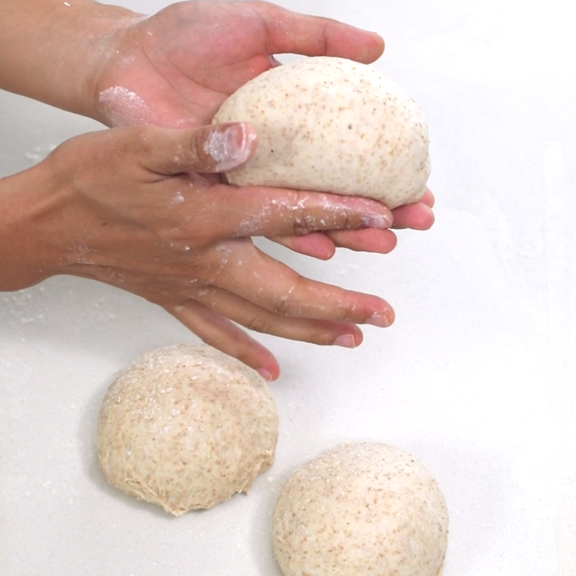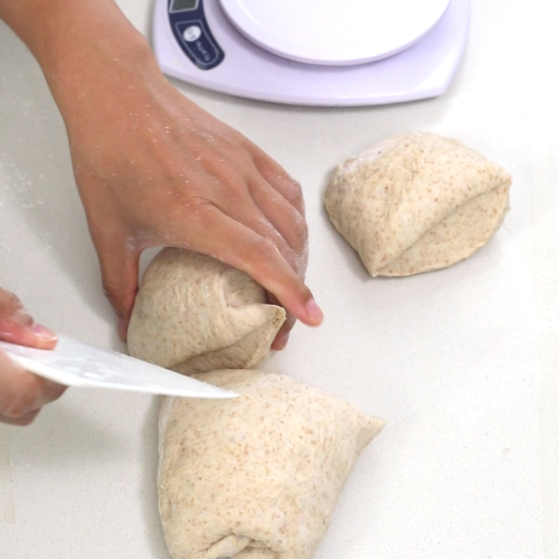 再把面团按185g一个平均分为三份,分割时尽量判断准确,否则切的零零碎碎,也是会影响面包组织的。