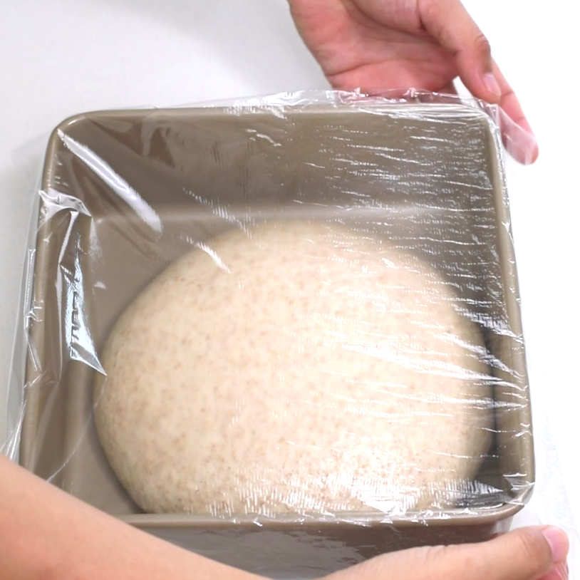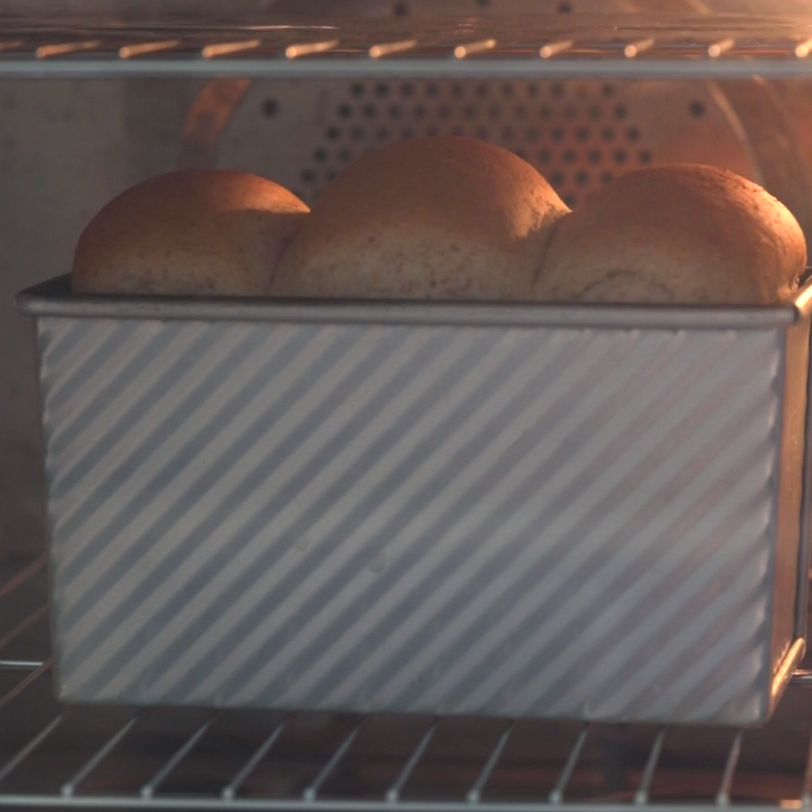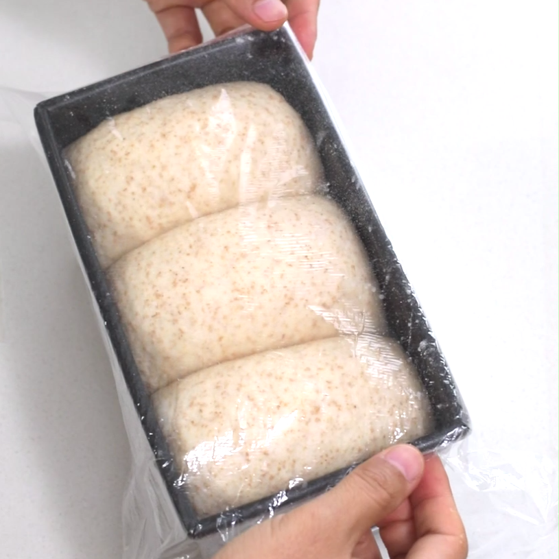 排入吐司盒,盖保鲜膜,35度发酵50分钟至9成满。由于每个人的实际发酵温度不同,所以发酵时间因人而异,总体上我们宁可发酵温度偏低,也不要偏高,偏低无非是耗时长一点,而偏高会导致组织粗糙口感变差,甚至发酵过度。