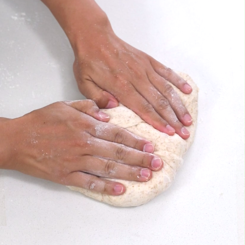 这个方子含水量较高,注意桌面撒高粉防粘,将面团对折两次并按压排气。排掉2/3气体就好,按死了会影响后续发酵。