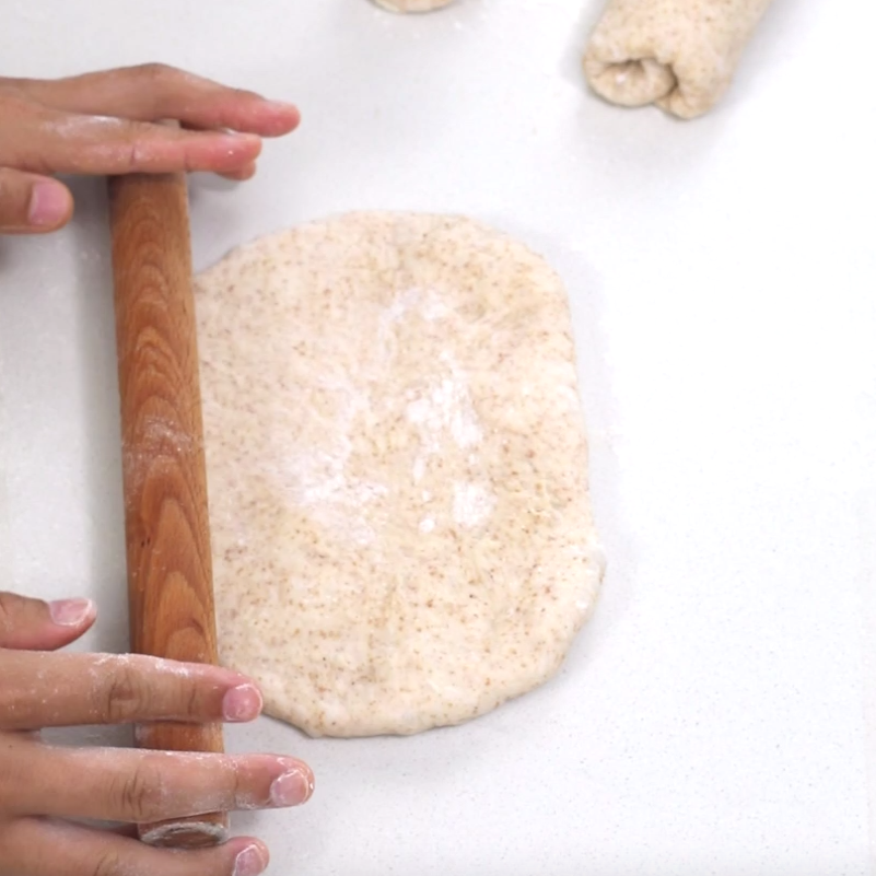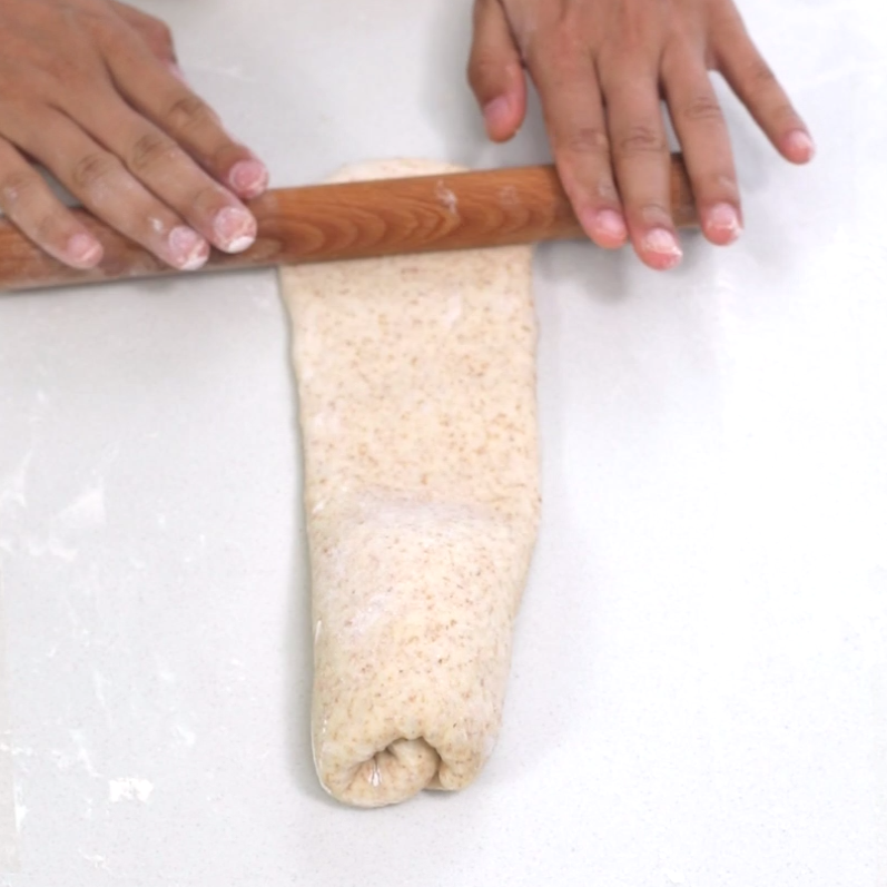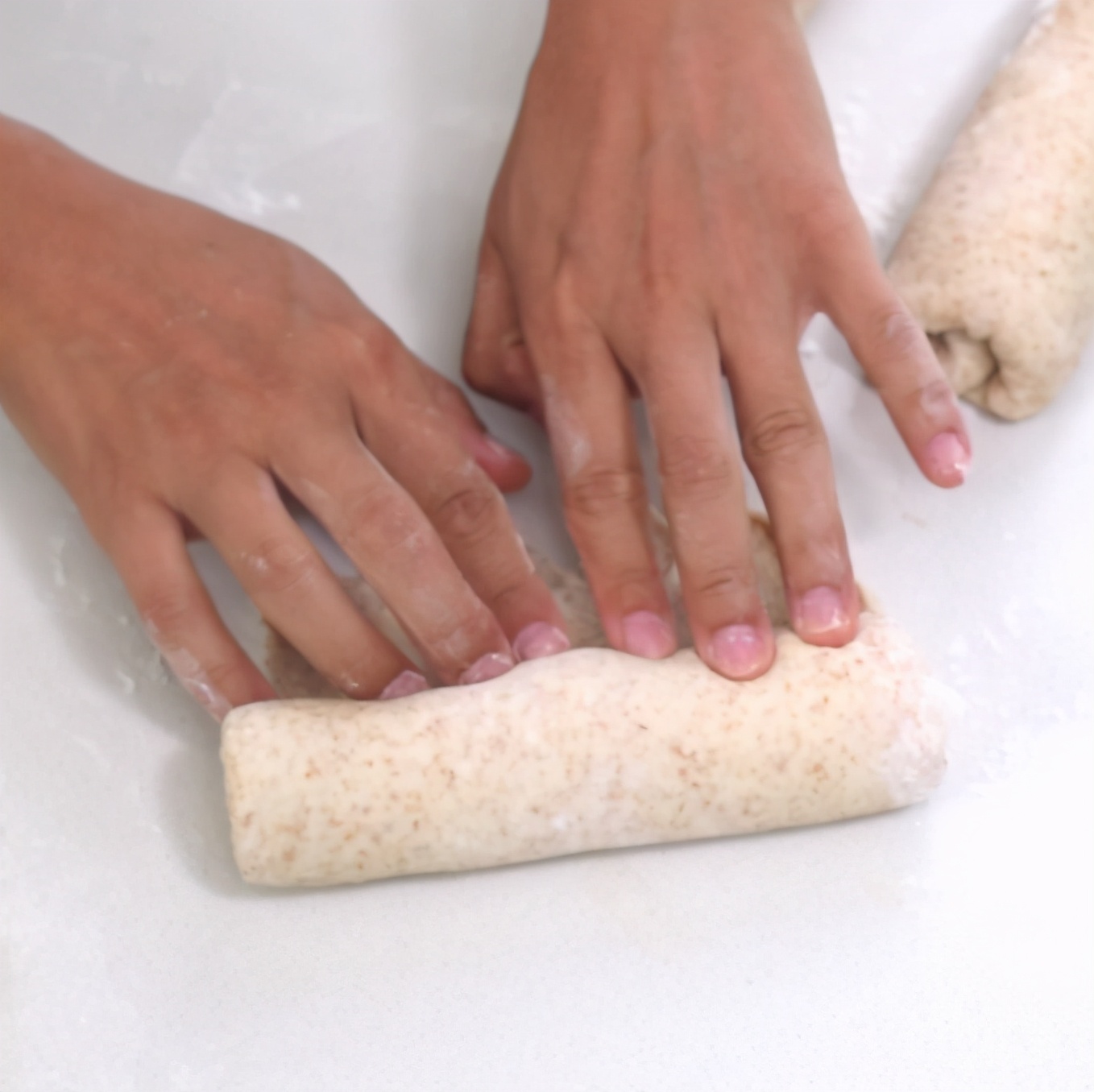 拍扁四周气泡,底部扒开,卷成圆柱体,注意擀长条不要超过23厘米,卷起来的圈数不要超过三圈半,否则会影响发酵体积。