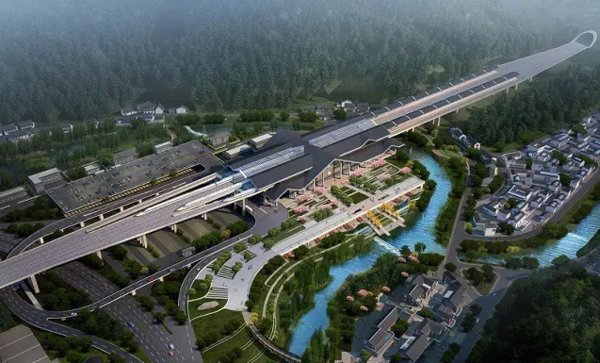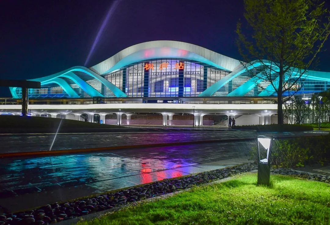 桐庐站站房设计建设以国画焦墨运笔为灵感,同富春山山体构成了“U”形景观山脉。桐庐站站前广场地面景观绿化面积占70%以上,桐庐站建设了三条滨水廊道,让来往于此的乘客仿佛置身于《富春山居图》之中。