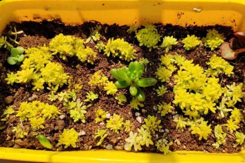 室内养护,建议使用颗粒含量不高于3成的配土,提供给其充足的肥力的同时也具有一定的疏松透气性,不容易板结,如果自己觉得配土麻烦,网购那种多肉小苗土就可以。花盆的话也尽量选那些盆面较宽的矮盆,尽量不要使用颗粒铺面,一方面这种爆盆的多肉铺面的美观效果被遮挡,另一方面铺面石真的会影响到黄金万年草的生长,没有什么科学依据,都是日常的养护观察所得的经验,可以作为参考。