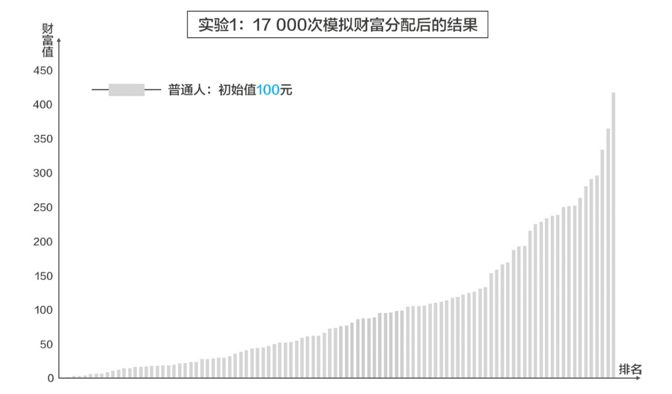 前10%的人掌握着超过30%的财富;前20%的人掌握着超过半数的财富;最富有的人财富为417元,是初始值的4倍多…… 而超过60%的人已低于100元;超过40%的人不足50元……