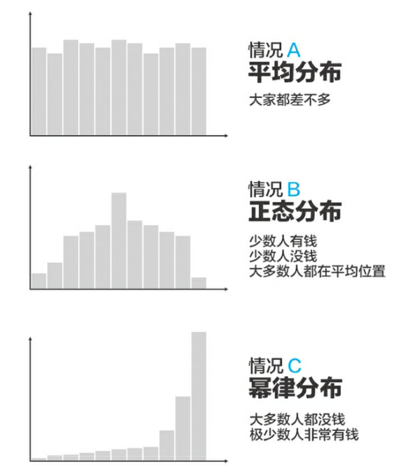 例如:一名职场人士通过不断的换工作来提升收入,通过10年时间换了5次工作,做到了部门总监,也不过年薪百万,因为很少公司为部门总监开出1千万的年薪。而创业就不一样了,虽然风险比较大,但通过持续学习,可以降低创业风险,如果创业5次,一旦一次成功就可能收入千万,同样是10年时间,同样是5次选择,因为一个是正态分布(上班收入)一个是幂律分布(创业收入),导致了不同的结果。