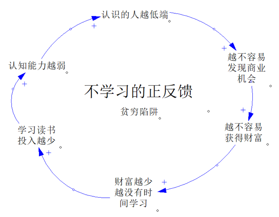 下面我们再来看一看,不学习的正反馈。不学习容易让你跌入贫穷的陷阱。假如你学习和读书的投入时间特别少,你的认知能力就会弱,看不清世界的本质。那你就认识不了高端人士。就越不容易发现商业机会。你经常不知道自己该干什么。面对生活的压力,你只能做一些低价值的劳动,工资也很低。为了获得更多的收入,你不得不再打一些零工、做一些兼职等。这样学习的时间就没有啦,认知能力就越来越弱,形成了一个恶性循环,跌入贫穷陷阱,永远跑不出去。