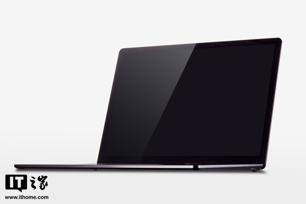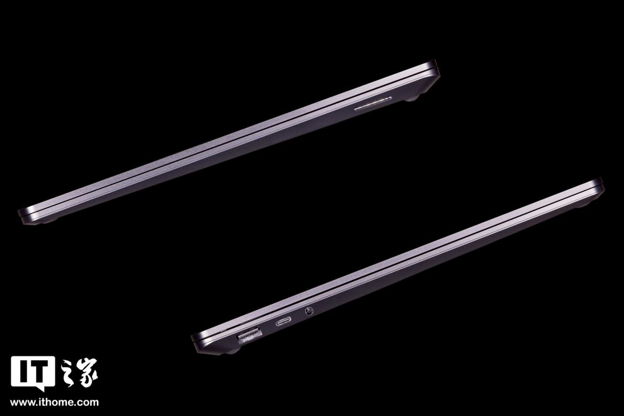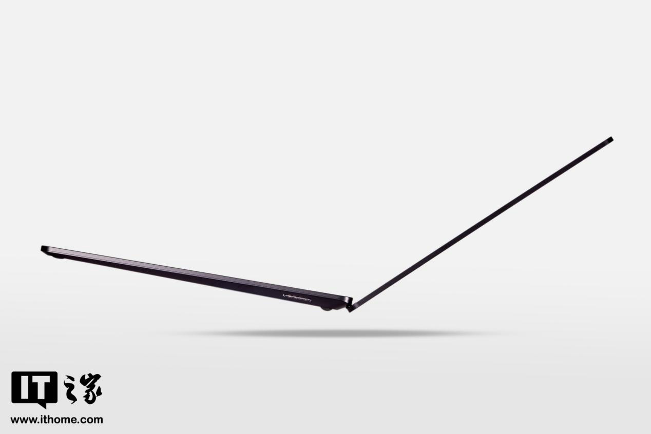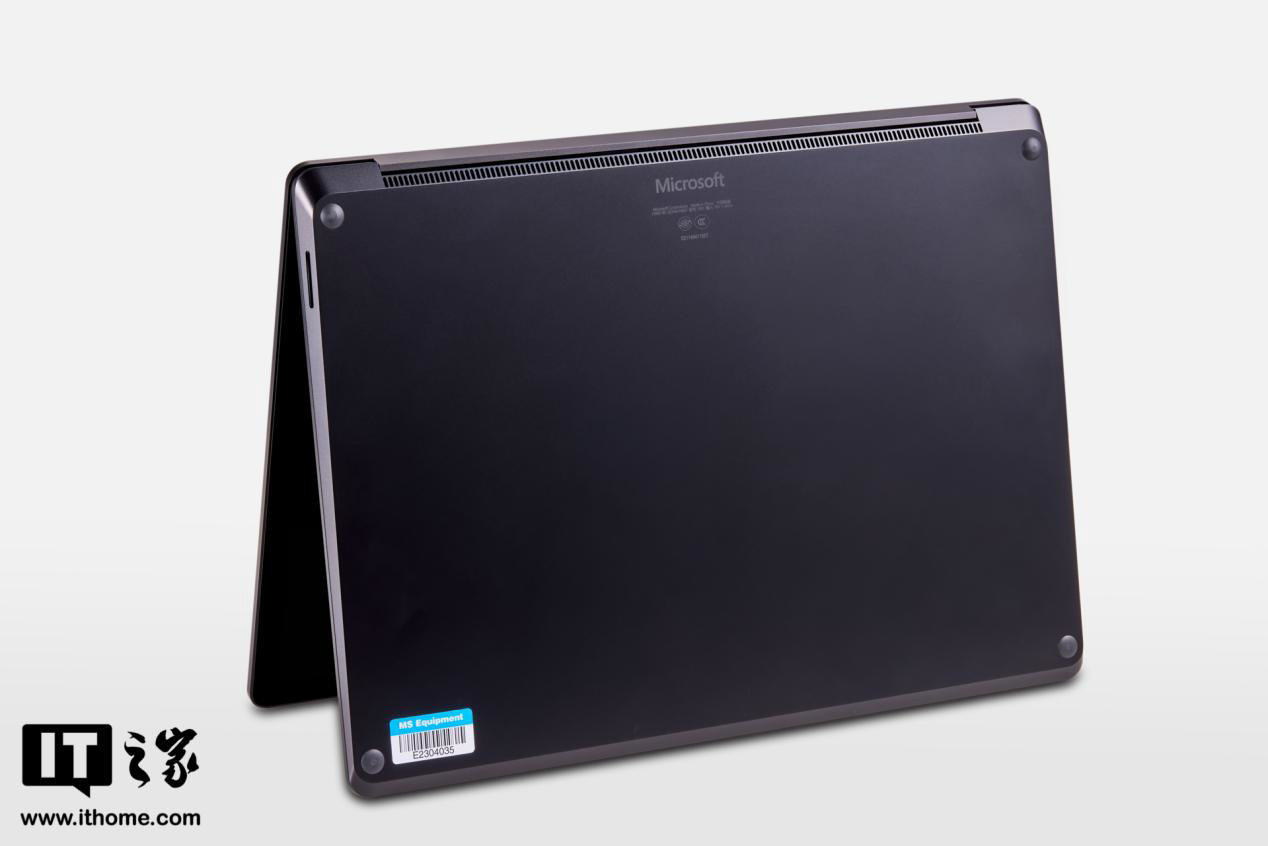 而最让IT之家感叹其极简的是笔记本的 D 面,整个 D 面一马平川,除了四个硅胶脚垫外就没有多余的设计元素了,就连“Mirosoft”产品信息都采用深灰色,隐藏于黑色之中。即便是轻薄本,也很少看到 D 面这么简洁的产品,看着很舒服。