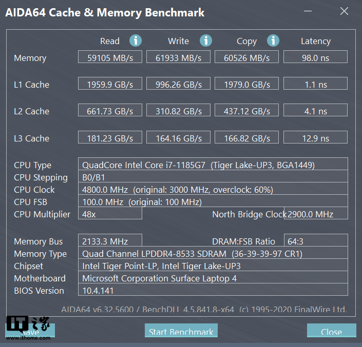 接下来是内存与缓存测试,在《AIDA64》中,Surface Laptop 4 的内存读取速度为 59105MB/s,写入速度为 61933 MB/s,拷贝速度为 60526 MB/s。