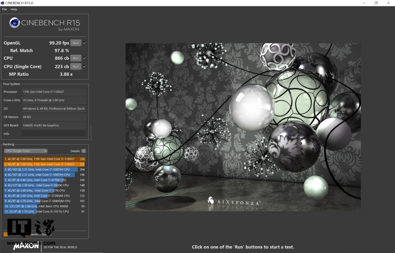 在体验时,IT之家也对这款 Surface Laptop 4 进行了性能测试。首先是《CineBench R15》 的跑分测试,Surface Laptop 4 的单核成绩为 223cb,多核成绩为 866cb,符合 i7-1185G7 处理器的正常水平。