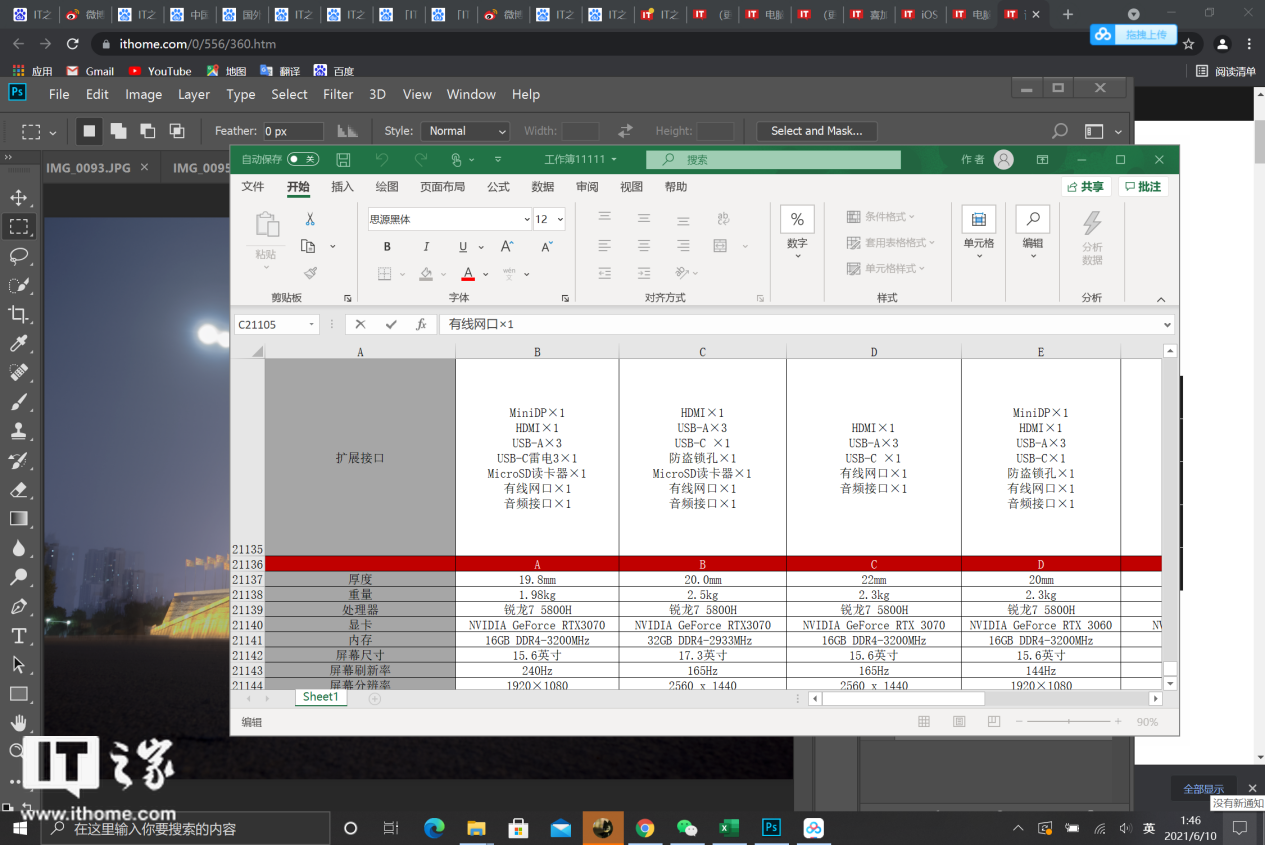 在测试中,IT之家在 Surface Laptop 4 上用 Chrome 浏览器打开 20 个网页标签,同时用 Photoshop 打开 10 张大小 1MB 左右的照片,QQ、微信聊天软件同时打开,网盘也开启,最后打开一个 21144 行的 Excel 表格。这个测试环境相信是高于一般用户办公场景下的运算负荷的。