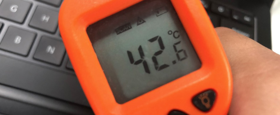 在进行《3D Mark》测试时,IT之家顺便测了一下 Surface Laptop 4 机身表面的温度,键盘区域温度比较高,为 42.6℃,而触控板周围掌托附近的温度为 37.2℃,使用的时候是能感受到机身在明显发热的。