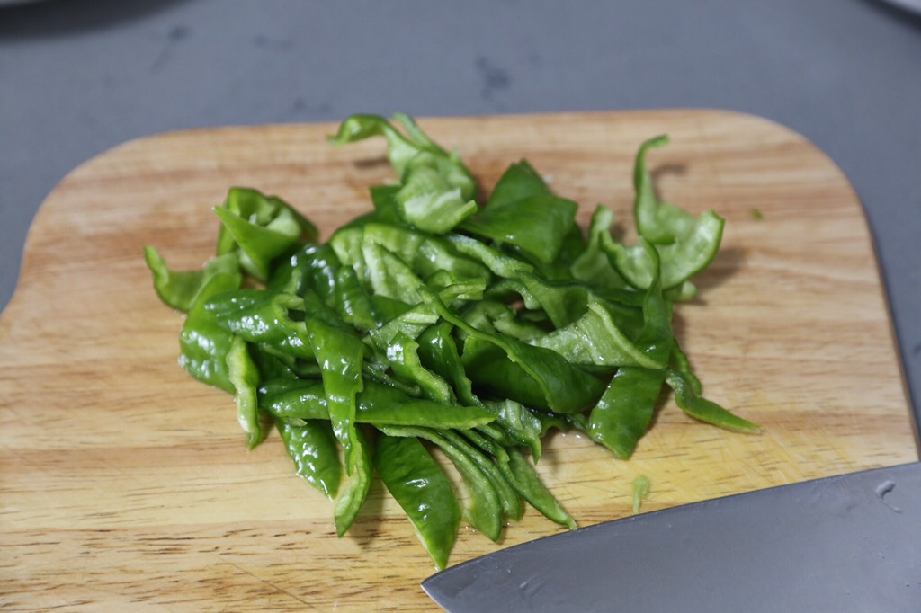 步骤1:挑选好上述几种食材,青椒切掉蒂,对半切开刮掉青椒籽,青椒切成若干细丝,几瓣大蒜全部剁成细末,将小葱全部切好备用。