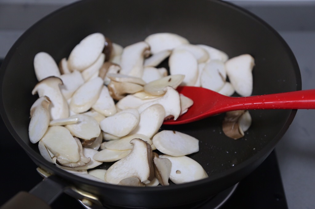 步骤4:锅底加上食用油,加上葱段和蒜泥,快速将其炒几下,先下入杏鲍菇煸炒变软,快速翻炒几下。