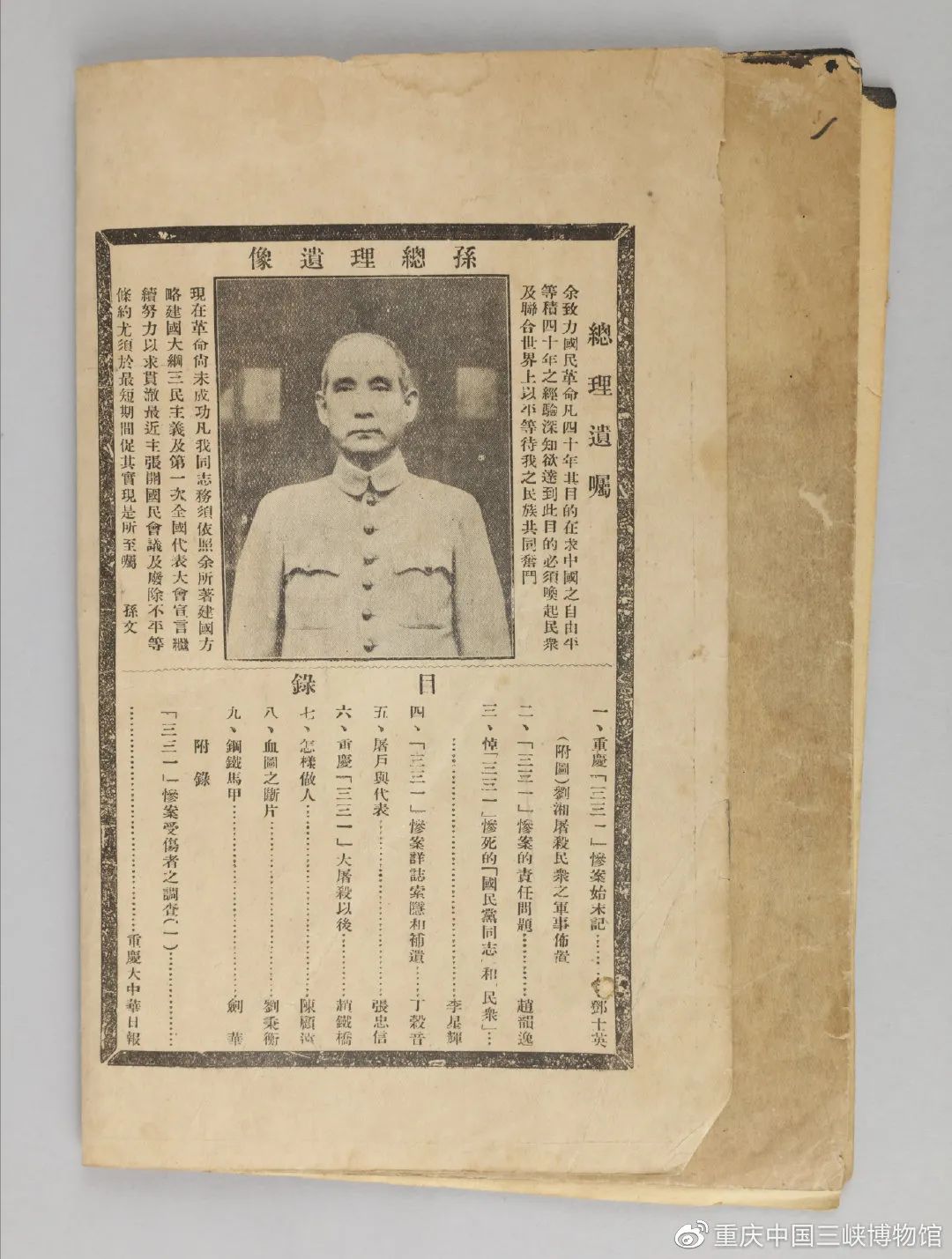 1928年3月,重庆市民召开大会纪念“三三一”惨案发生一周年,特出《重庆“三三一”惨案纪念特刊》(第一册),向广大群众揭露了“三三一”惨案的真相和反动军阀的丑恶行径,是研究“三三一”惨案的珍贵史料。