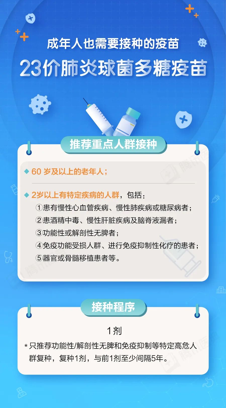 60岁及以上的老年人,以及2岁以上的特殊人群,都推荐接种23价肺炎球菌多糖疫苗。