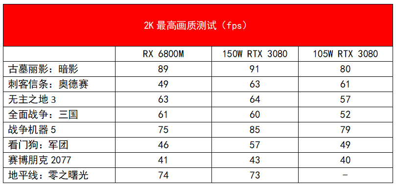 在2K分辨率最高画质下,RX 6800M在不少3A大作中的表现已经达到了150W款的RTX 3080水平,自然也就超过了105W的RTX 3080(也可以看做是较高功率款的RTX 3070),例如《古墓丽影:暗影》、《无主之地3》、《全面战争:三国》、《赛博朋克2077》、《地平线:零之曙光》等游戏。