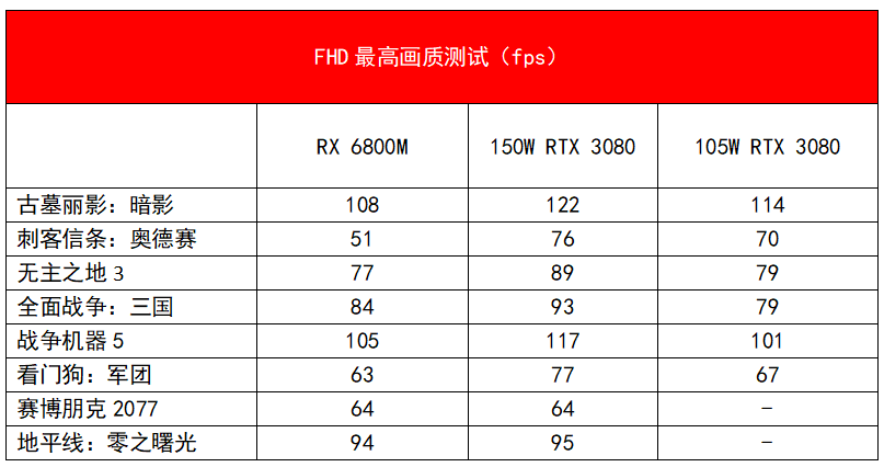 游戏实测中,为了大家可以比较直观全面地了解到RX 6800M的性能表现,我们先来看看FHD游戏对比测试,并且和上面一样加入了105W、150W款RTX 3080进行对比。