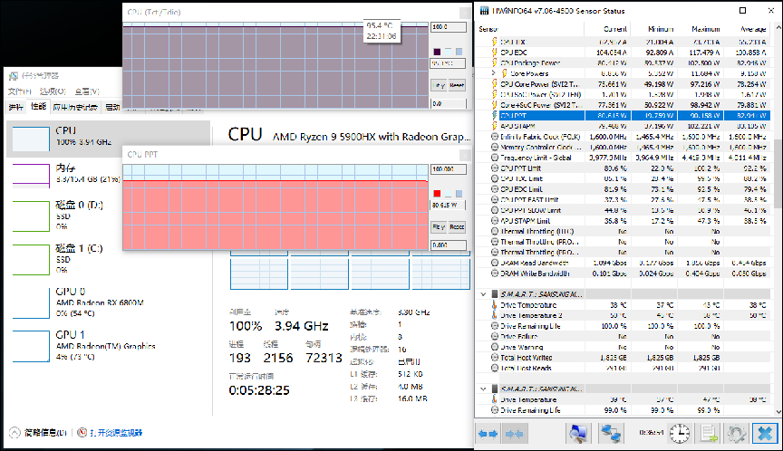 在室温26℃并开启空调的情况下,利用Aida64对魔霸5R进行单考FPU,半小时后,锐龙9 5900HX稳定在80W功率附近,频率在3.9~4GHz之间,温度控制在95℃左右。从考机来看,魔霸5R的性能释放非常强力!再考虑到锐龙9 5900HX的高规格参数,可以推测,该机的性能测试将会非常不错。