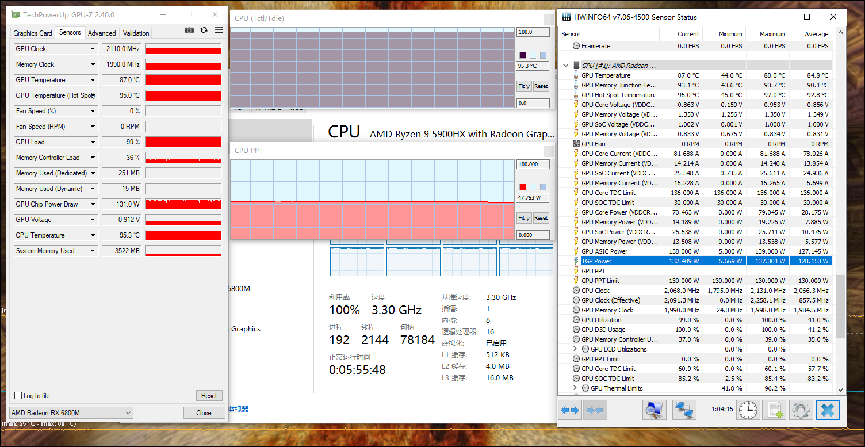 在室温25℃(开启空调)环境下双考机,魔霸5R的满载双核心功率约为180W(如果环境温度高一些,那么考机时的总功率则响应略有降低)。由于牛叔是先单考处理器,所以最终双核心的情况是:CPU在47.7W左右,温度约95℃,频率3.3GHz;GPU的功率在132W左右,频率在2000MHz以上,温度87℃。散热能力不错,双核心的功率也比较高,当然高功率下内核的温度也就不低了。
