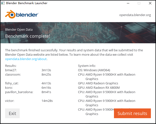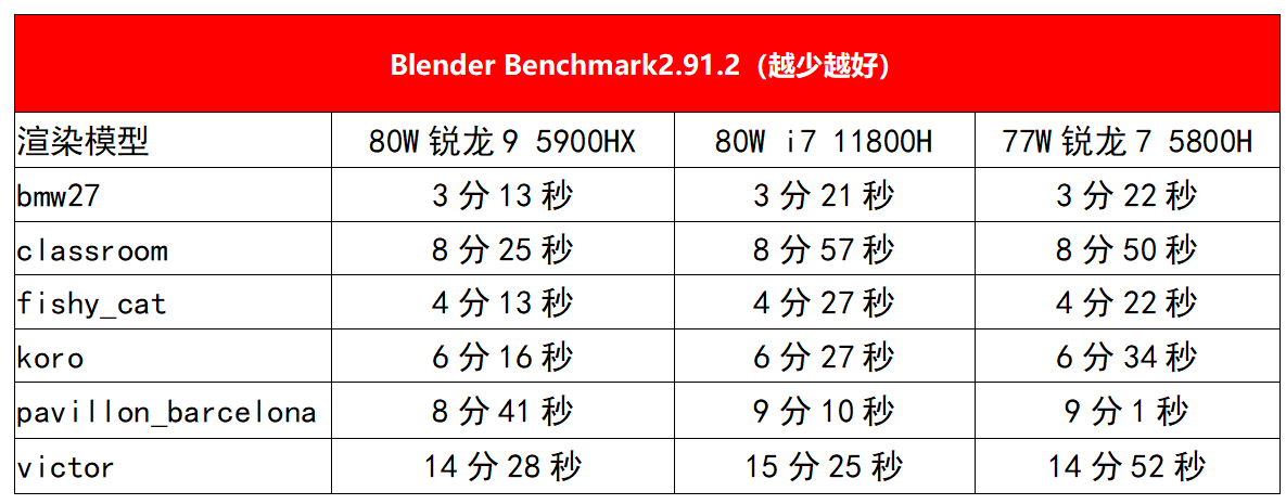牛叔选择了Blender六个场景连续渲染来考查魔霸5R这颗锐龙9 5900HX的满载表现。在Blender满载测试中,80W的锐龙9 5900HX全部领先80W的i7 11800H,并且在较长的测试项目中优势较为明显,比如victor测试项目,锐龙9 5900HX用时14分28秒,i7 11800H用时则为15分25秒。而77W的锐龙7 5800H则与80W款i7 11800H成绩接近,而且在较长的项目中也有一定优势。