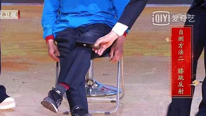 测试方法:测试者坐在凳子上,跷二郎腿放松,另一人可以用手机敲击测试者的髌韧带处。观察测试者脚尖反射,若伴随敲击脚尖有轻微弹起说明正常,但如果脚尖弹起幅度过大,像是窜出去,说明有一定问题,建议就医筛查。