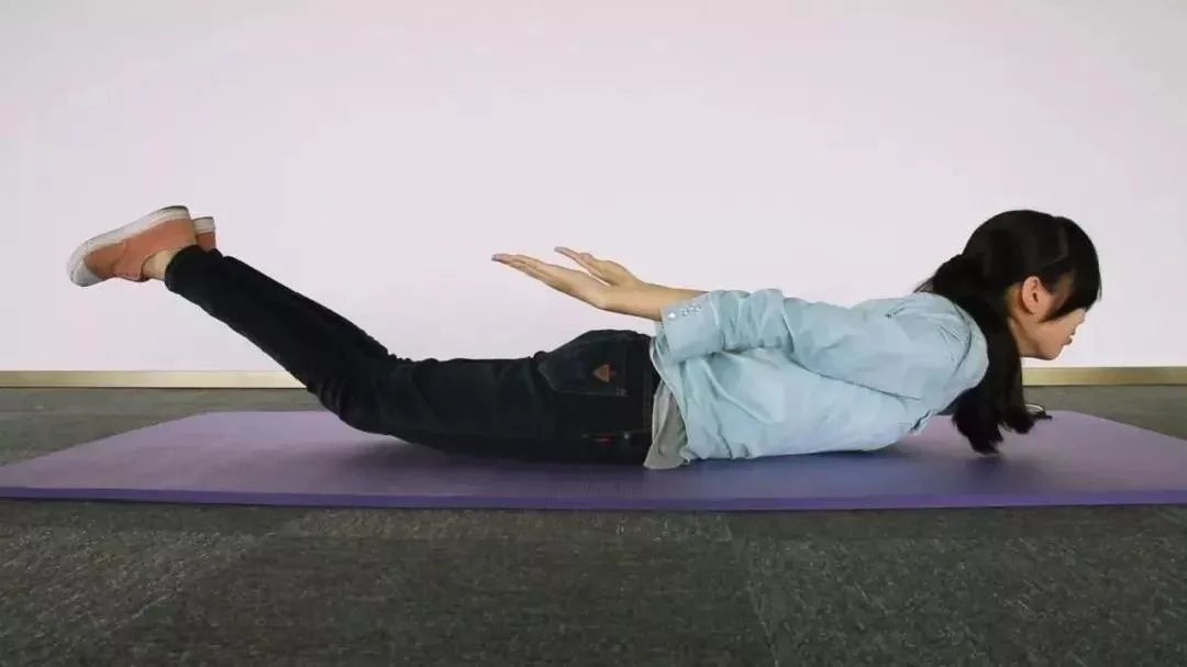 ①飞燕展翅:俯卧,双手背向放好,膝盖伸直,头和腿都尽量向上翘。坚持5秒,然后放松,如此重复15遍为一组。每天2次,每次3组。