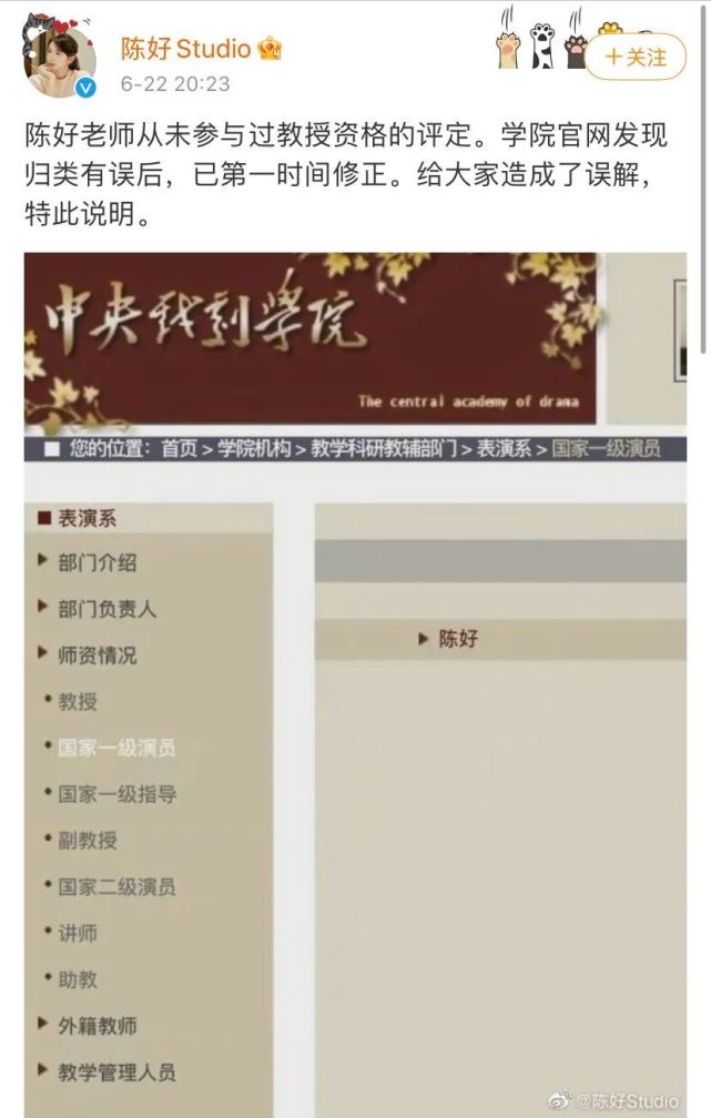 对此,陈好工作室官方微博@陈好Studio 22日晚发布消息称:“陈好老师从未参与过教授资格的评定。学院官网发现归类有误后,已第一时间修正。给大家造成了误解,特此说明。”