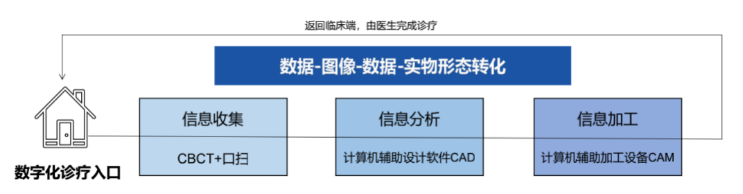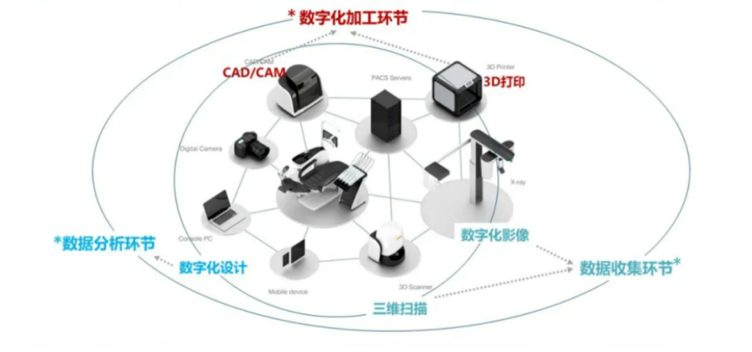 《2020中国口腔产业数字化趋势报告》认为,口腔数字化产业归属于数据-图像-实物之间的形态转化,可分为三大环节: